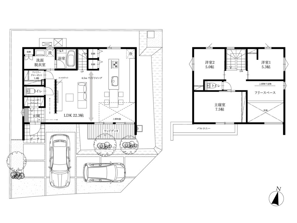 | 備考 | 外構付き、長期優良住宅、オール樹脂サッシ、全熱交換型換気、浴室乾燥暖房機、オール電化、スマートキー、食器洗浄機乾燥機、TVモニター付きインターホン、SI-COLLABORATION、ワイドリビング、DJ構法、吹抜け、アイランドキッチン、大容量カップボード、エコカラット、ウッドデッキ |