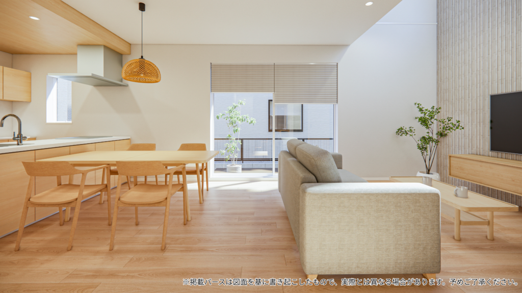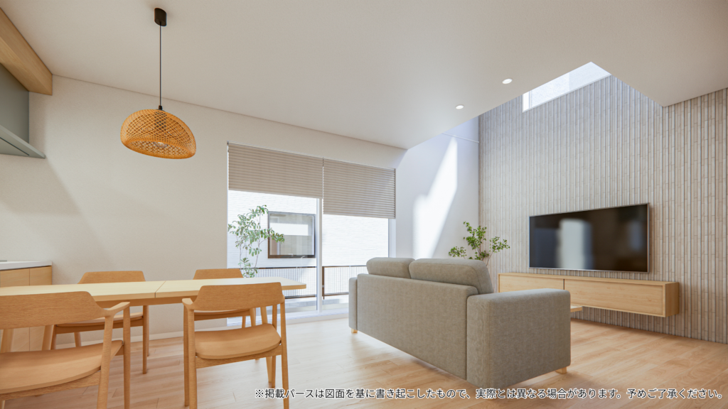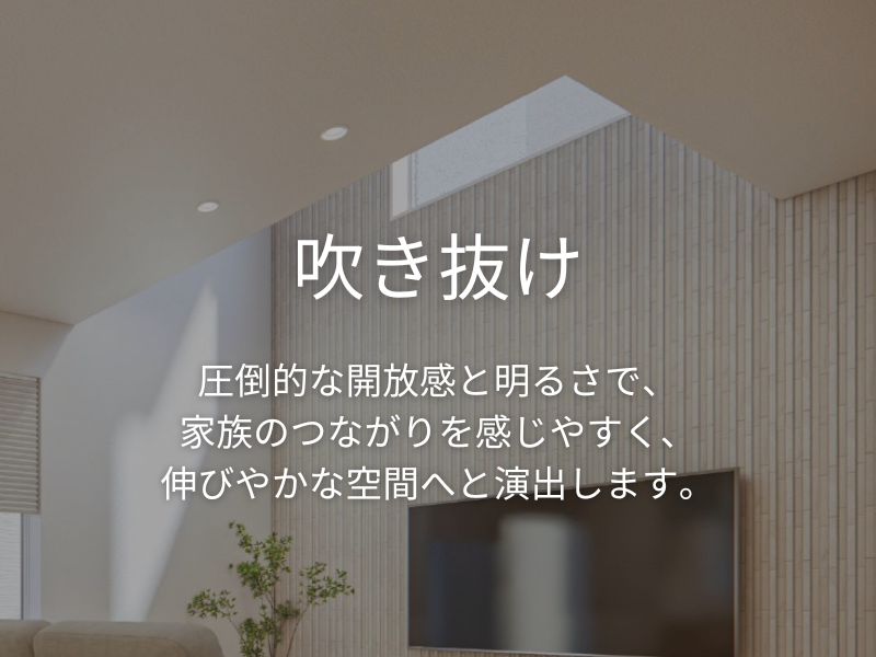 吹抜けから光が差し込み、心地よい明るさと開放感のあるリビング