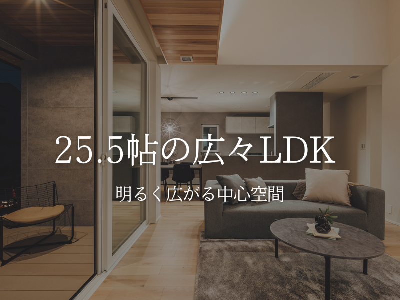 「LDKは広く、開放感のある空間にしたい」というご要望から、25.5帖に加えて大開口窓の先へバルコニーを連続させ、視線が外へ抜ける設計にしました。窓の取り方と外部空間のつなげ方は、広く見せたい方の参考になります。