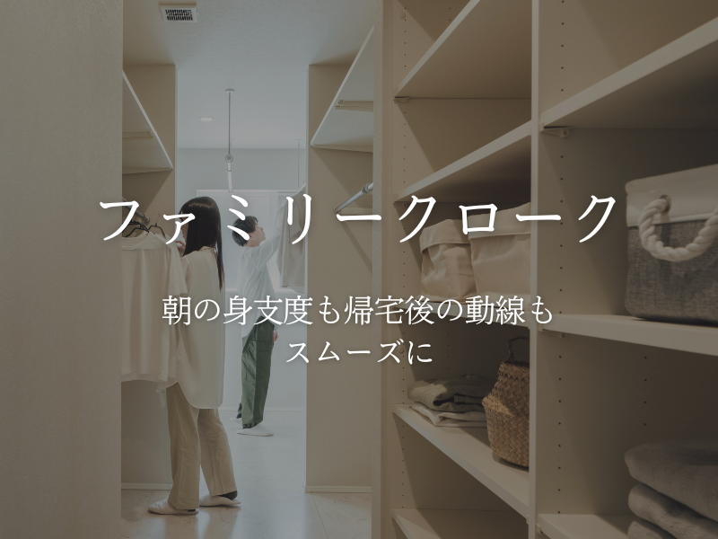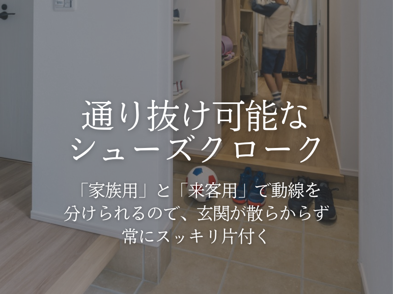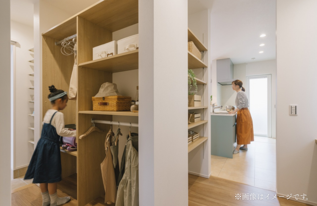 しまう場所が点在するのではなく、生活動線に沿って使う場所の近くに計画している事がポイントです。現地で「どこに何をしまうか」をイメージしながらご見学してみてください。