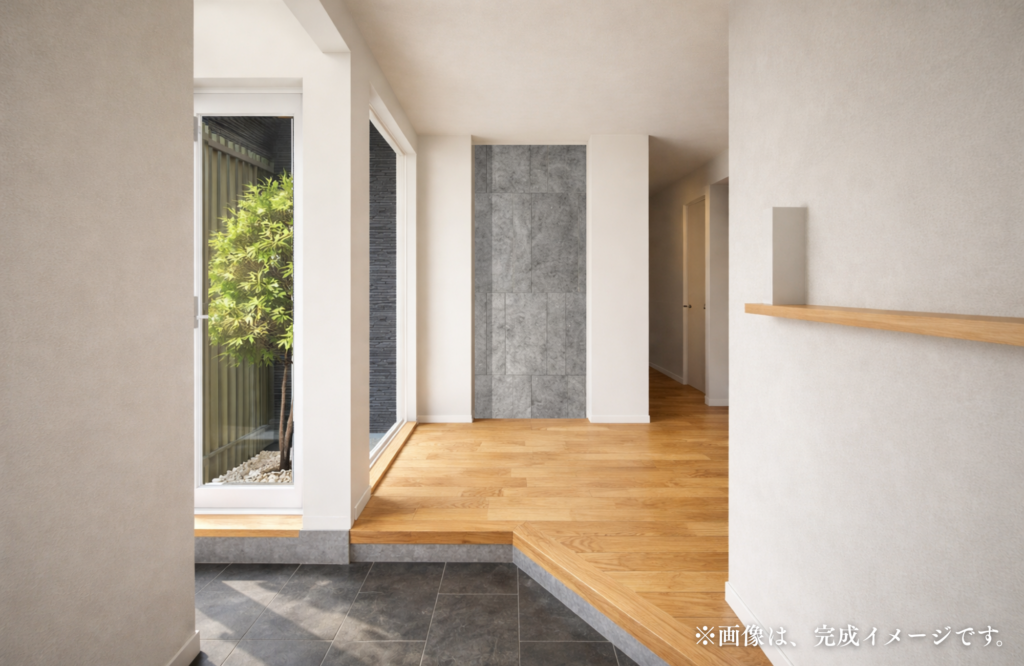 お施主様の「玄関をとにかく印象的に」というご希望から、植栽のある坪庭と、正面のタイル調アクセントをご提案。帰宅の瞬間に視線と気分を切り替えてくれる景色が楽しめる玄関です。