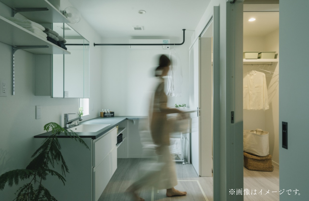 洗面脱衣・ランドリー・ファミリークローゼット・LDKがつながり、移動がしやすい動線設計。移動のムダを減らし、「洗って、干して、仕舞う」までを自然に完結できる間取りです。