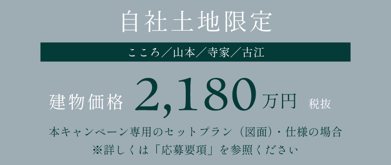 | 条件 | 以下のすべての条件を満たす方を対象とします。 1、契約・着工時期/ 2026年4月30日(日)までに弊社と建築工事請負契約の締結および、2026年内に着工が可能なこと。 2、建築主・居住/お申込み者ご本人が建築主として契約し、当該建物に居住されること。 3、建築場所/弊社が所有・販売する分譲地(こころ、山本、寺家、古江) 4、プラン・仕様/本キャンペーンが指定する建物図面および仕様にて建築いただけること。 5、広告承諾/完成建物の広告利用(HP・SNS・チラシ等への掲載)にご承諾いただき、弊社所定の「広告利用承諾書」へ署名・捺印いただけること。 【Wチャンス特典】 上記指定の建築地およびプラン以外で2026年4月30日(日)までに弊社と建築工事請負契約を締結いただいた場合、ご成約特別優遇として、地盤補強、外構工事、太陽光発電のいづれかをサービスを適用いたします。 |