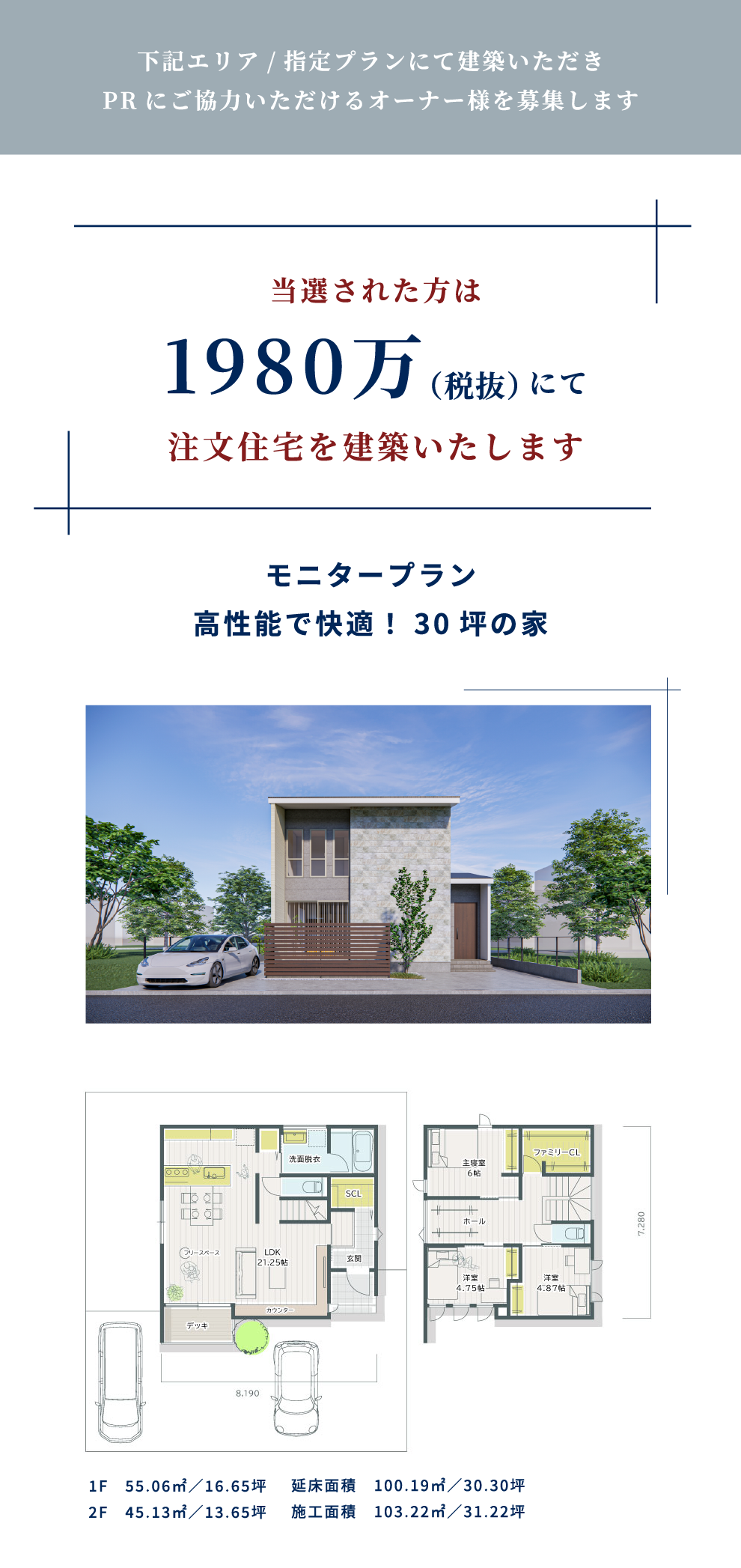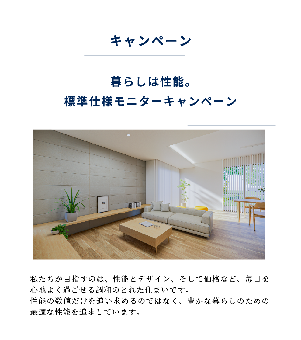 | 条件 | 以下のすべての条件を満たす方をモニターキャンペーンの抽選対象とします。 1、契約・着工時期/ 2026年2月28日(土)までに弊社と建築工事請負契約の締結および、2026年内に着工が可能なこと。 2、建築主・居住/お申込み者ご本人が建築主として契約し、当該建物に居住されること。 3、プラン・仕様/本キャンペーンが指定する建物図面および仕様にて建築いただけること。 4、モニター協力/完成建物の広告利用(HP・SNS・チラシ等への掲載)にご承諾いただき、弊社所定の「広告利用承諾書」へ署名・捺印いただけること。 5、建築場所/弊社施工エリア内(広島県および山口県岩国市近郊)に建築可能な土地をお持ちの方。(または取得予定の方) 土地をお持ちでない方には、弊社にて土地情報をご提供いたします。 【Wチャンス特典】 上記指定プラン以外で2026年2月28日(土)までに弊社と建築工事請負契約を締結いただいた場合、ご成約特別優遇として限定10組100万円分のサービスを適用いたします。 |