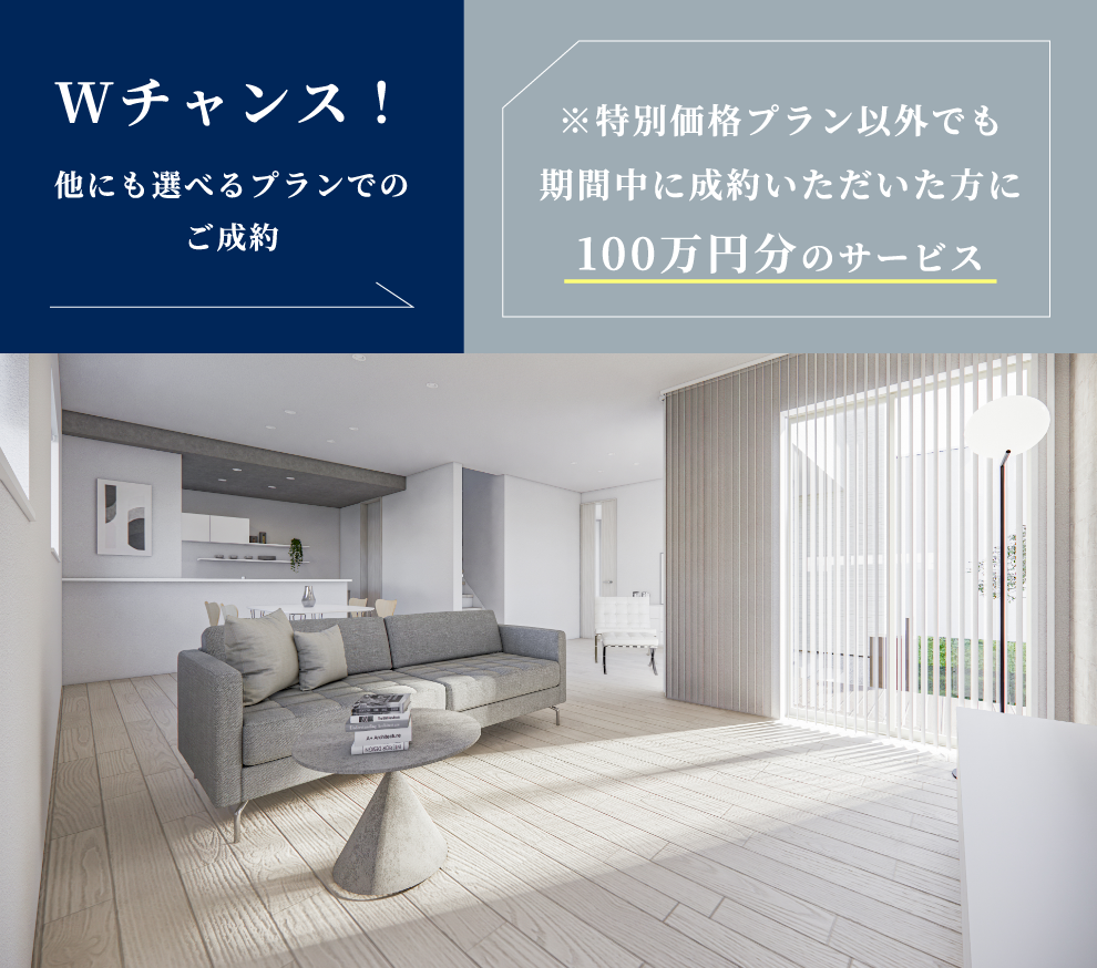 ■Wチャンス 本キャンペーン指定プラン以外で建築工事請負契約を締結いただいた場合、ご成約特別優遇として100万円分のサービスを適用いたします。