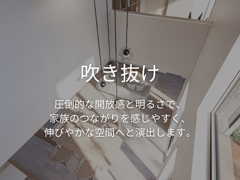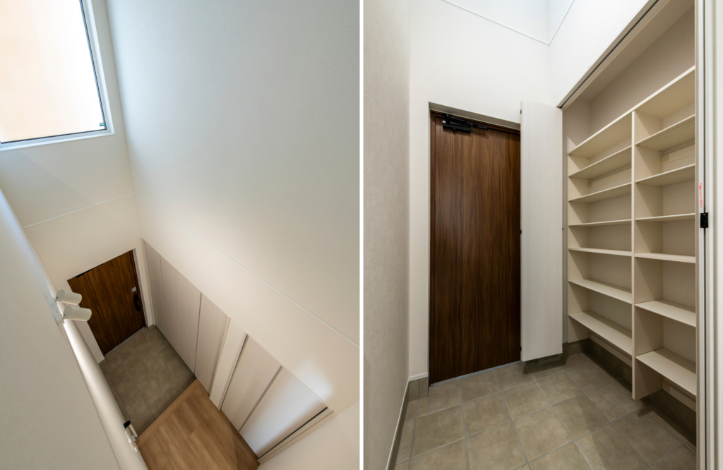 光が降り注ぐ吹抜けと、大容量収納。心地よさの土台をつくる玄関ホール 吹抜けから差し込む光が、家族を明るく迎える真っさらな空間。 大容量の収納が、靴やスポーツ用品の「定位置」となり、玄関を常にスッキリ保ちます。 さらに断熱等級6の性能が、冬の冷え込みを抑え、家じゅうどこにいても心地よい温度をキープ。 何もない今だからこそ感じる、光の暖かさと機能性を大切にしました。