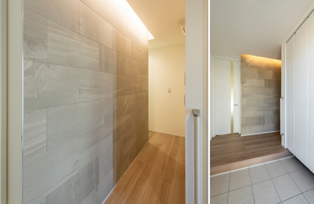更に動線上の玄関ホールは間接照明とタイルの質感が際立つ上質な空間となっています。
