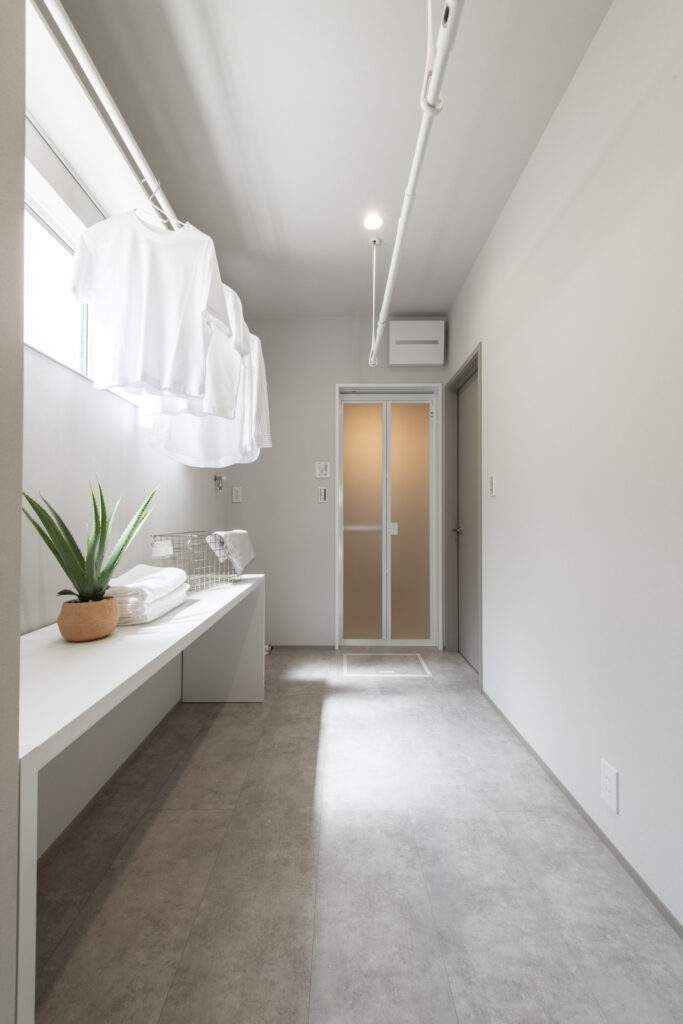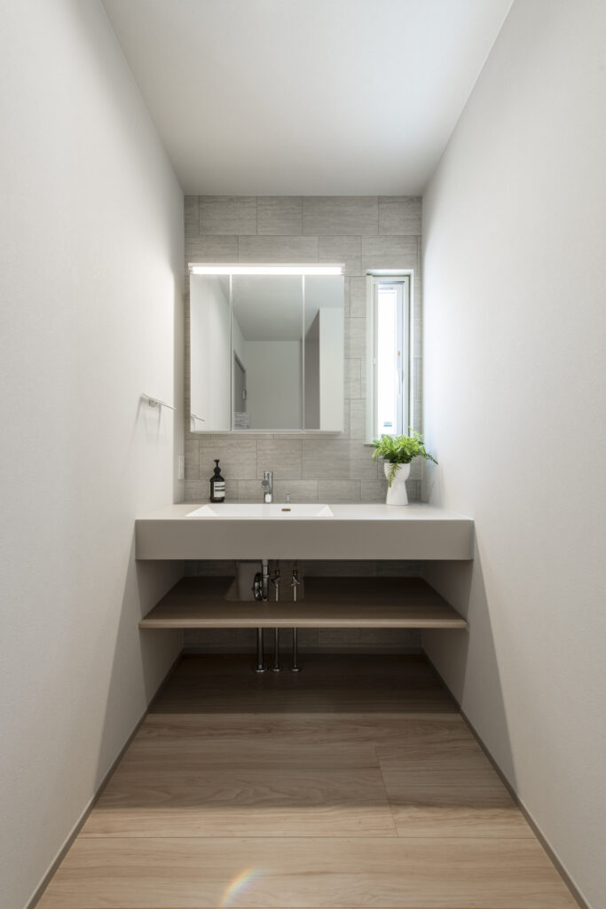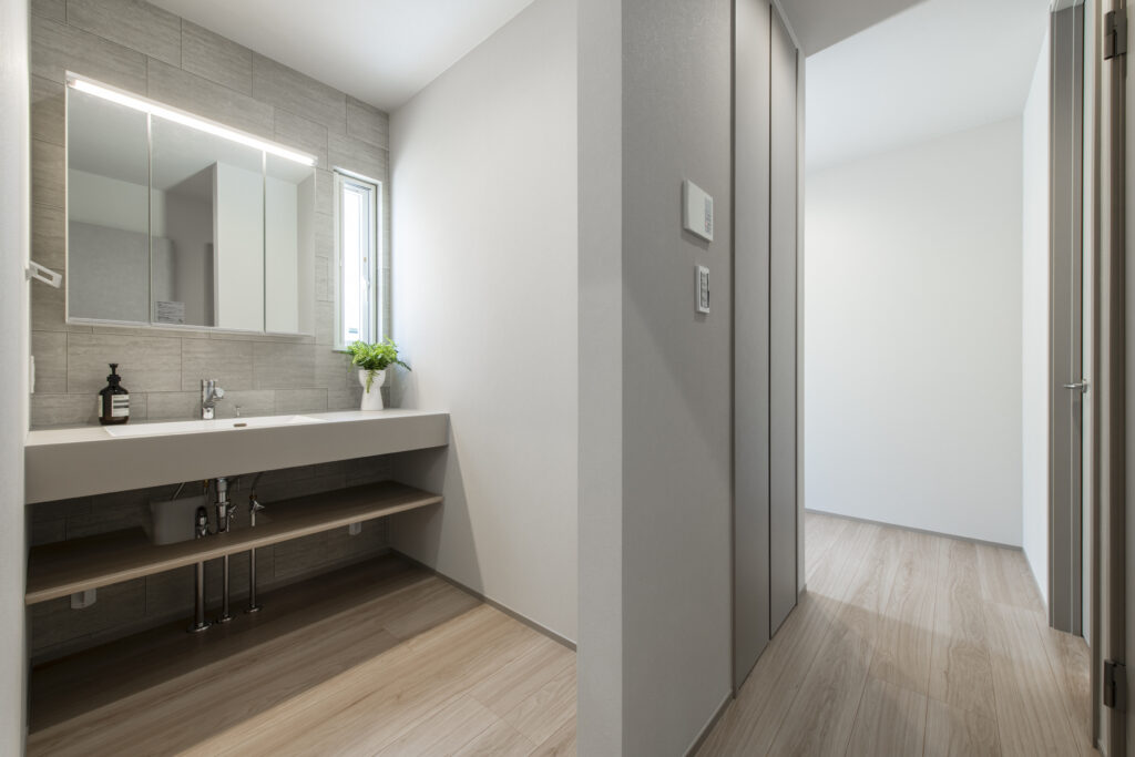 洗面とランドリーを分けた設計で、朝の支度や帰宅後の手洗いもスムーズ。