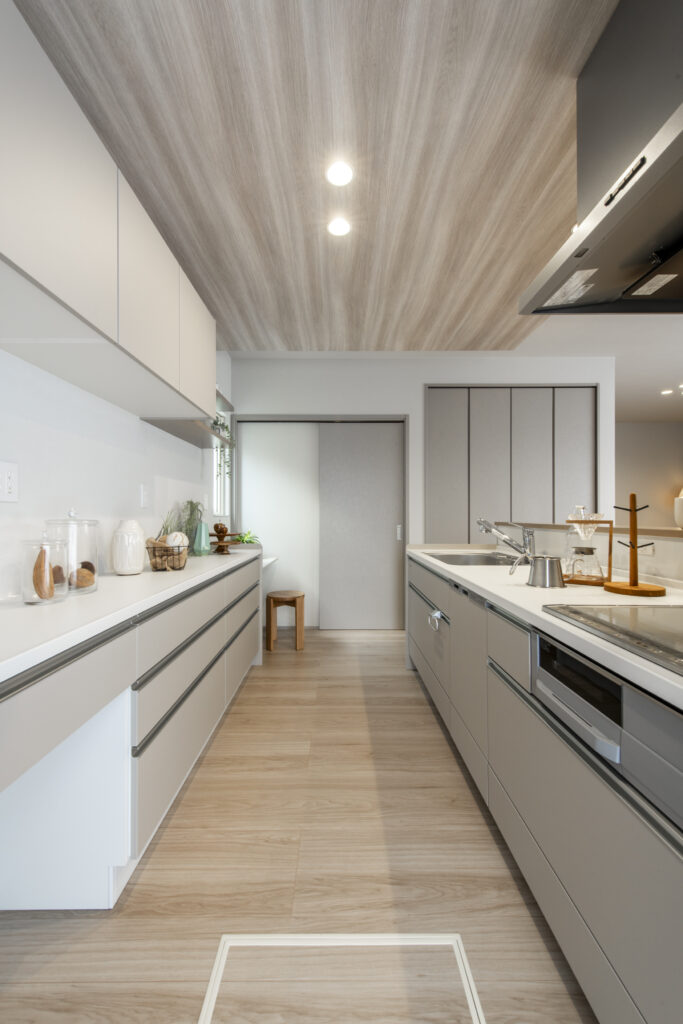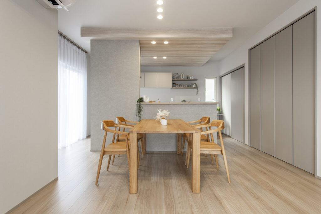 天井高2.6mの開放感とアイランドキッチンが広がる21.5帖のLDK。大きなリビングには自然と家族が集まり、食事や会話が弾む日常に。「広すぎず高すぎない」ちょうどいい贅沢感で、デザインと快適さを両立した空間です。