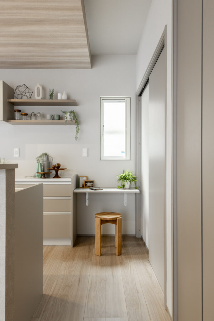 ホールからリビング、洗面、ランドリー、キッチンをぐるっと回れる回遊動線。家事や子育ての動きがスムーズになり、暮らしに余裕をもたらします。