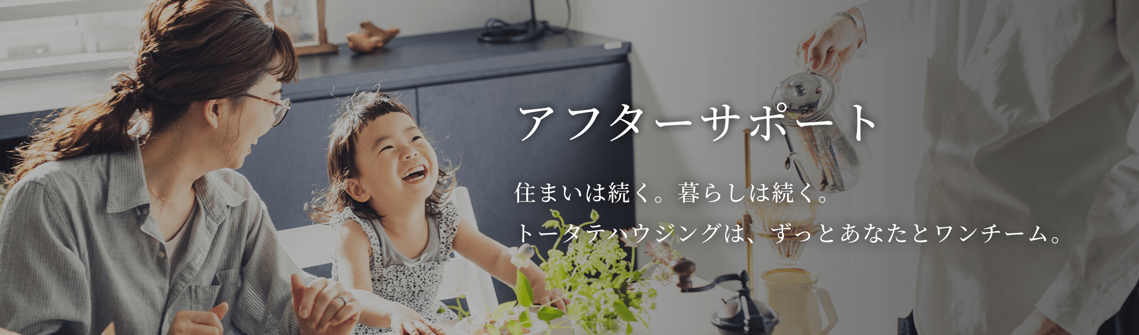 トータテのリフォーム 暮らし方の変化に合わせたリフォームに対応 私たちの家づくりは、建てて終わりではありません。 トータテグループは、お客様の「生涯のパートナー」として、お子様の成長や独立など、暮らしの変化に合わせたサポートを続けます。将来のリフォームもトータテリフォームセンターが対応。グループの総合力で、永続的な安心をお届けします。 体感型ショールーム「リフォームギャラリー」まで、どうぞお気軽にお立ち寄りください。
